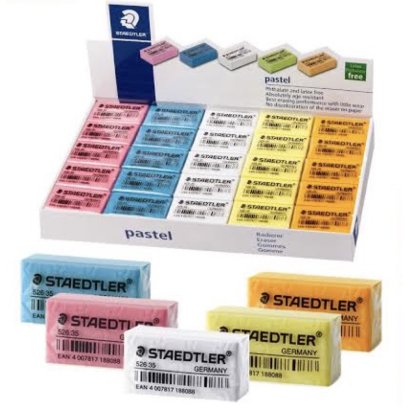 ยางลบดินสอ Staedtler 526 35P TH (แพ็ค 3 ก้อน) สีพาสเทล ผลิตจากวัสดุคุณภาพดี จะเขียนผิดแค่ไหนก็ลบง่าย ลบสะอาด ไม่เป็นขุย ไม่ทำลายเนื้อกระกระดาษ สามารถลบดินสอได้ทั้งบนกระดาษทั่วไป บนกระดาษไข และมั่นใจได้เลยว่าจะเขียนใหม่อีกครั้งก็สามารถลบได้อย่างสะอาดหมดจดเหมือนเดิม