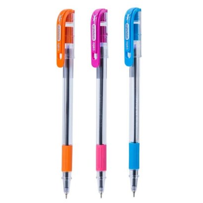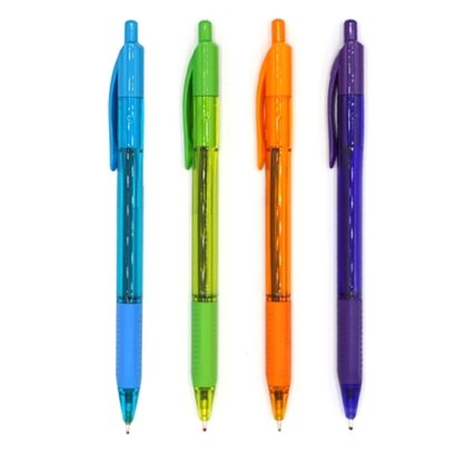 ปากกาลูกลื่น แบบกดหมึกสูตรพิเศษเขียนลื่นกว่าปากกาลูกลื่นธรรมดาทั่วไป มีคลิปหนีบปลายด้าม พกพาสะดวก มี Rubber Grip นุ่มจับกระชับมือ ความยาวด้าม (รวมปลอก) 14.5 ซม.ขนาด 0.7 มม.หมึกสีน้ำเงินด้ามคละสี